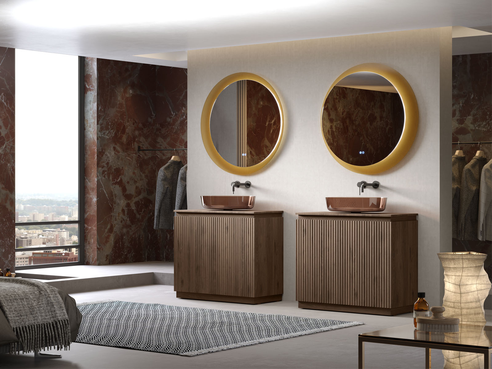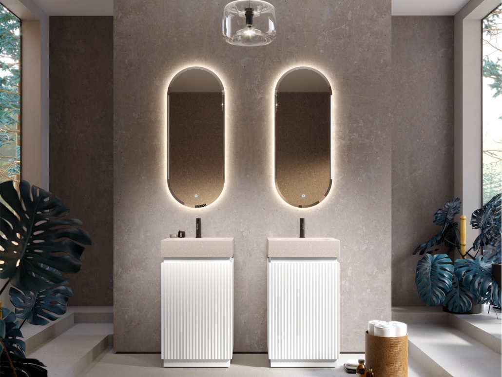 Vollendet wird die Kollektion durch einen eleganten zweitürigen Hochschrank mit Glasfächer und integrierten Zubehör sowie eine Auswahl an LED-Spiegeln- und Spiegelschränken.Pura ist Schönheit, die Ordnung schafft, denn Funktionalität ist der neue Luxus in der Innenarchitektur.