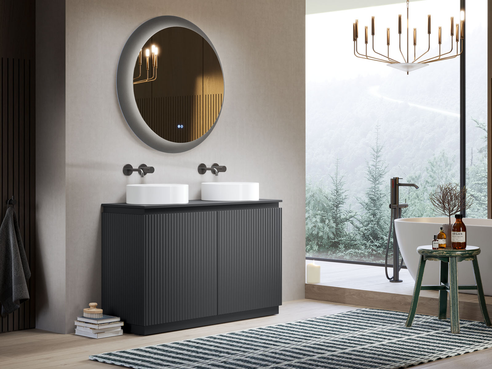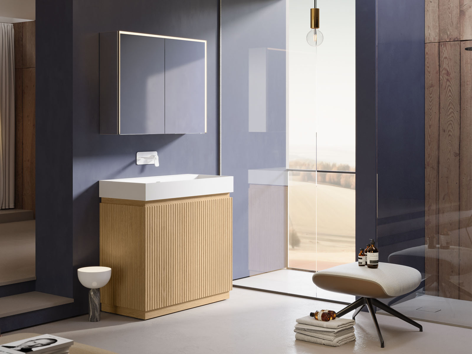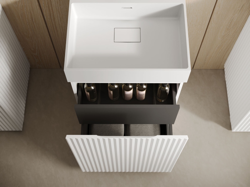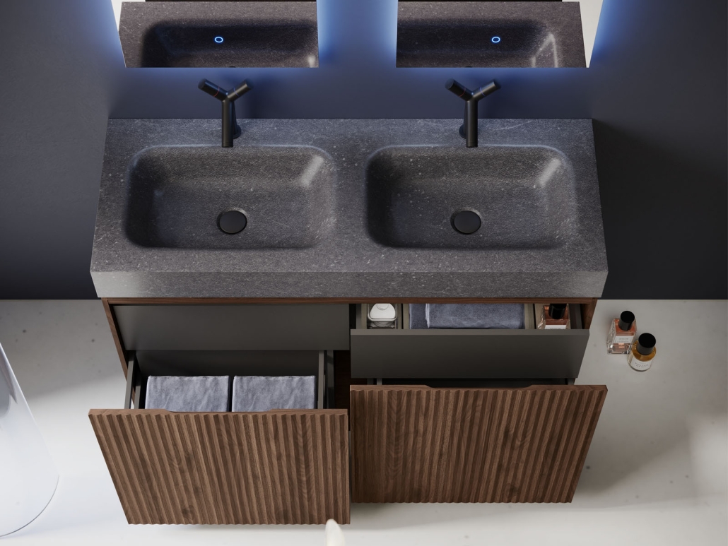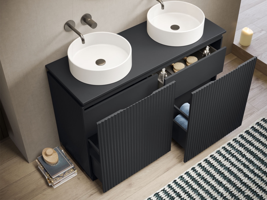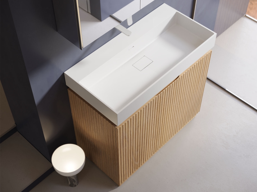 Pura, eine Kollektion, die den Bedürfnissen des modernen Wohnens gerecht wird und Design und Funktionalität perfekt vereint.Pura verkörpert Authentizität und Funktionalität: Klare Linien, haptische Materialien und das geriffelte Detail verbinden Schönheit und visuellen Rhythmus und schaffen so ein Gleichgewicht zwischen Modernität und Funktionalität.Die Pura-Kollektion ist in verschiedenen Matt- und Holzausführungen erhältlich und bietet geräumige Standschubladen mit schmalen Soft-Close Führungen sowie Innenschubladen mit schwarz satinierten Glasfächer für das ordentliche verstauen der Badutensilien.Ob als Einzel- oder Doppelausführung – Pura ermöglicht den Einbau integrierter Waschbecken aus Mineralguss oder HPL alsauch Aufsatzkeramikbecken weiß oder farbiger Keramik.
